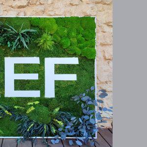 Reproduction du logo en lichens et végétaux stabilisés. Lettres en chêne véritable et peintes respectant la typographie